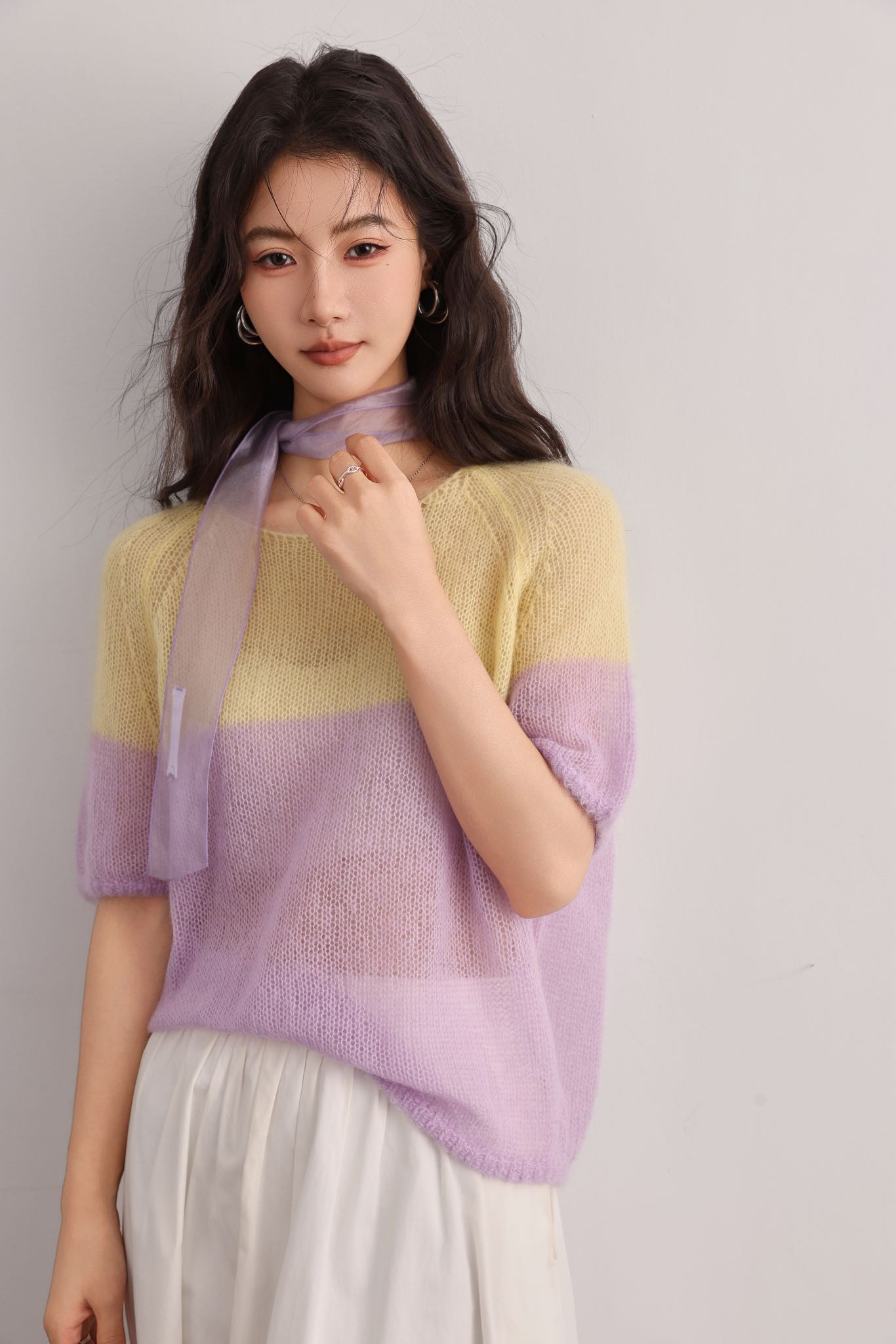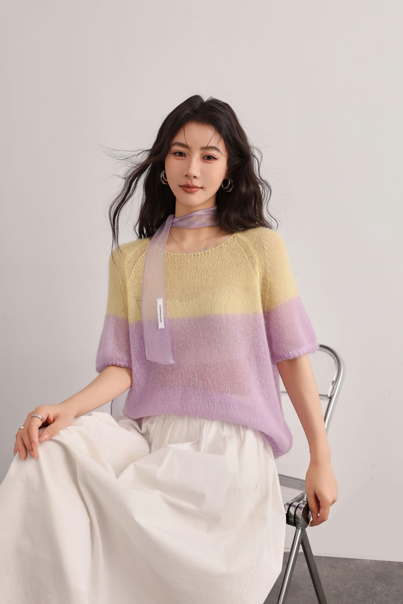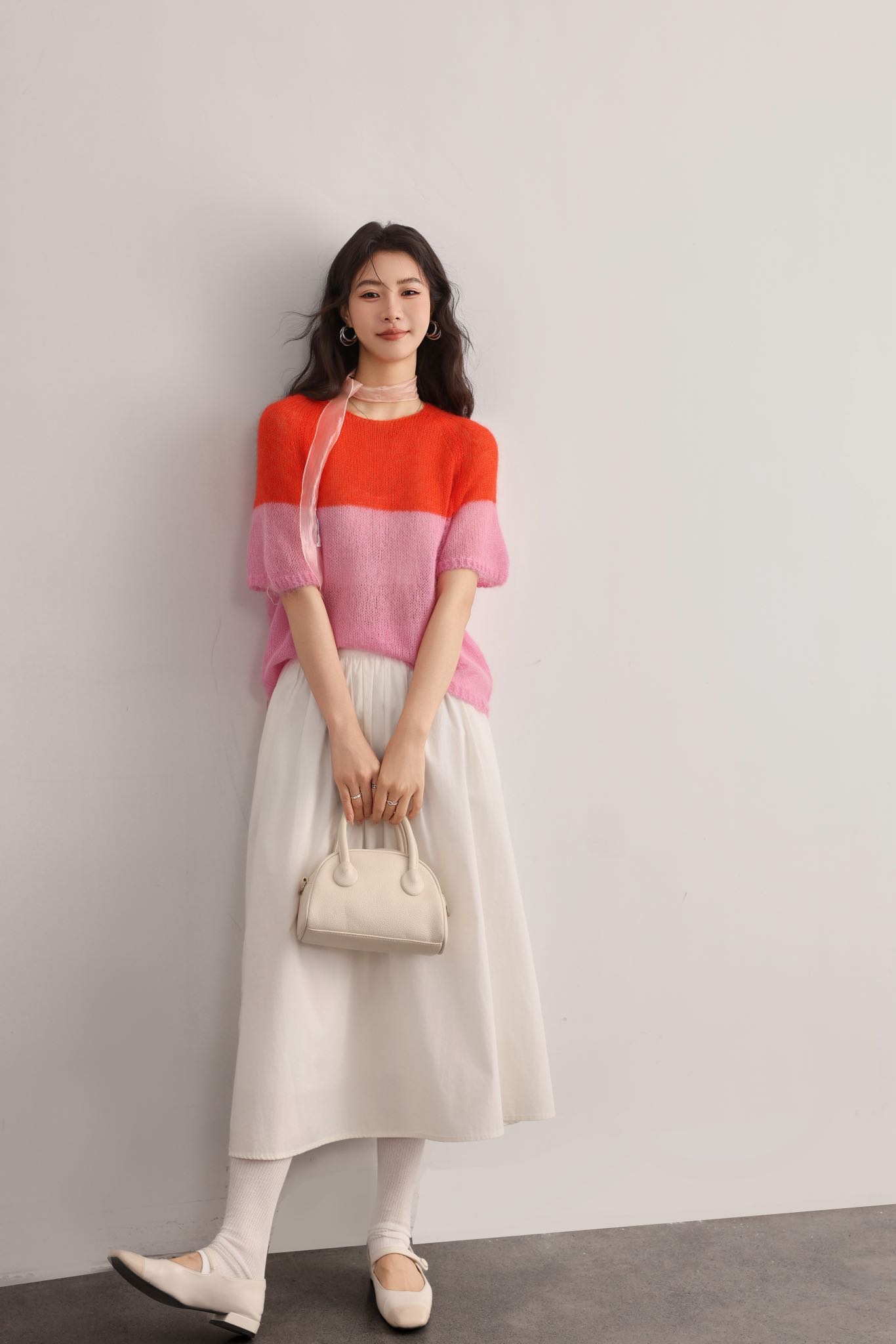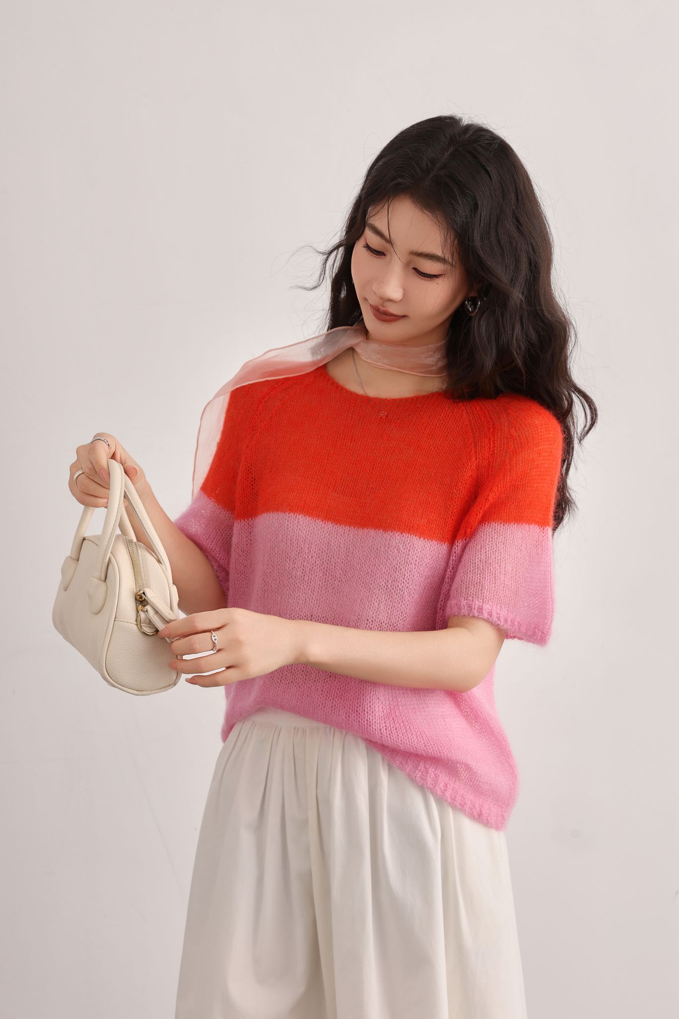 This color block mohair short sleeve sweater brings you the ultimate early autumn Korean fashion vibe. Made of high-quality mohair, it is fluffy, lightweight and breathable, with a delicate luster and airy texture that feels as soft as clouds against your skin. The eye-catching color-block design uses bright and fresh shades to create a youthful and energetic look, sweet but not excessive, stylish yet understated. The short-sleeve cut is ideal for late summer and early autumn, avoiding the heaviness of long sleeves while keeping the gentle knit feel. Its relaxed one-size silhouette offers a lazy, casual style that flatters all body shapes. You can wear it alone for a fresh look or layer it for more dimension. Perfect for school, dates, coffee trips and street photography, it easily creates a sweet, fashionable and photo-ready atmosphere. A must-have statement piece to brighten up your early autumn wardrobe.